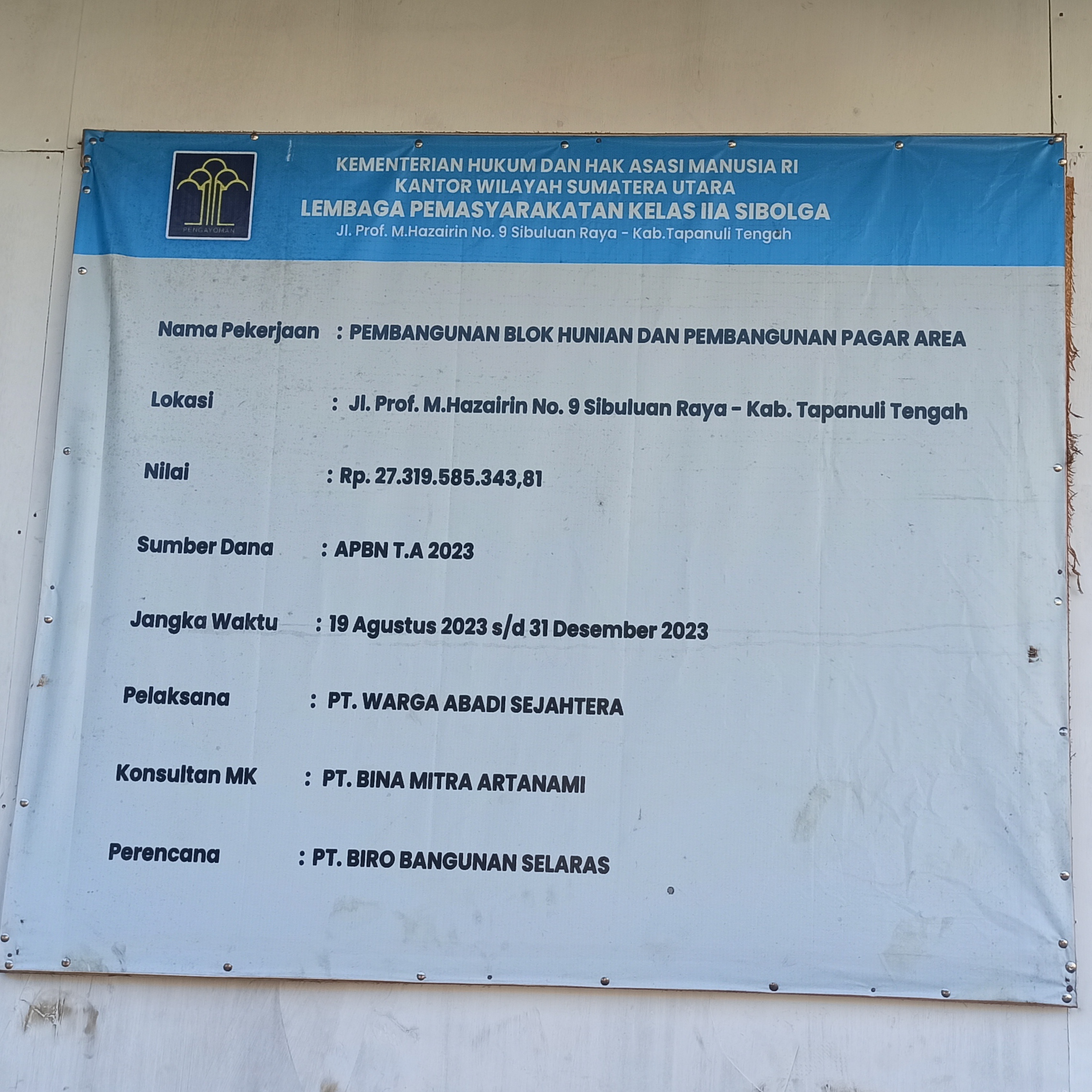 Diketahui, pembangunan Lapas Kelas IIA Sibolga bersumber dari APBN TA.2023 dibawah kewenangan Kementerian Hukum dan Hak Azasi Manusia RI dengan pagu sebesar Rp27.319.585.343,81.