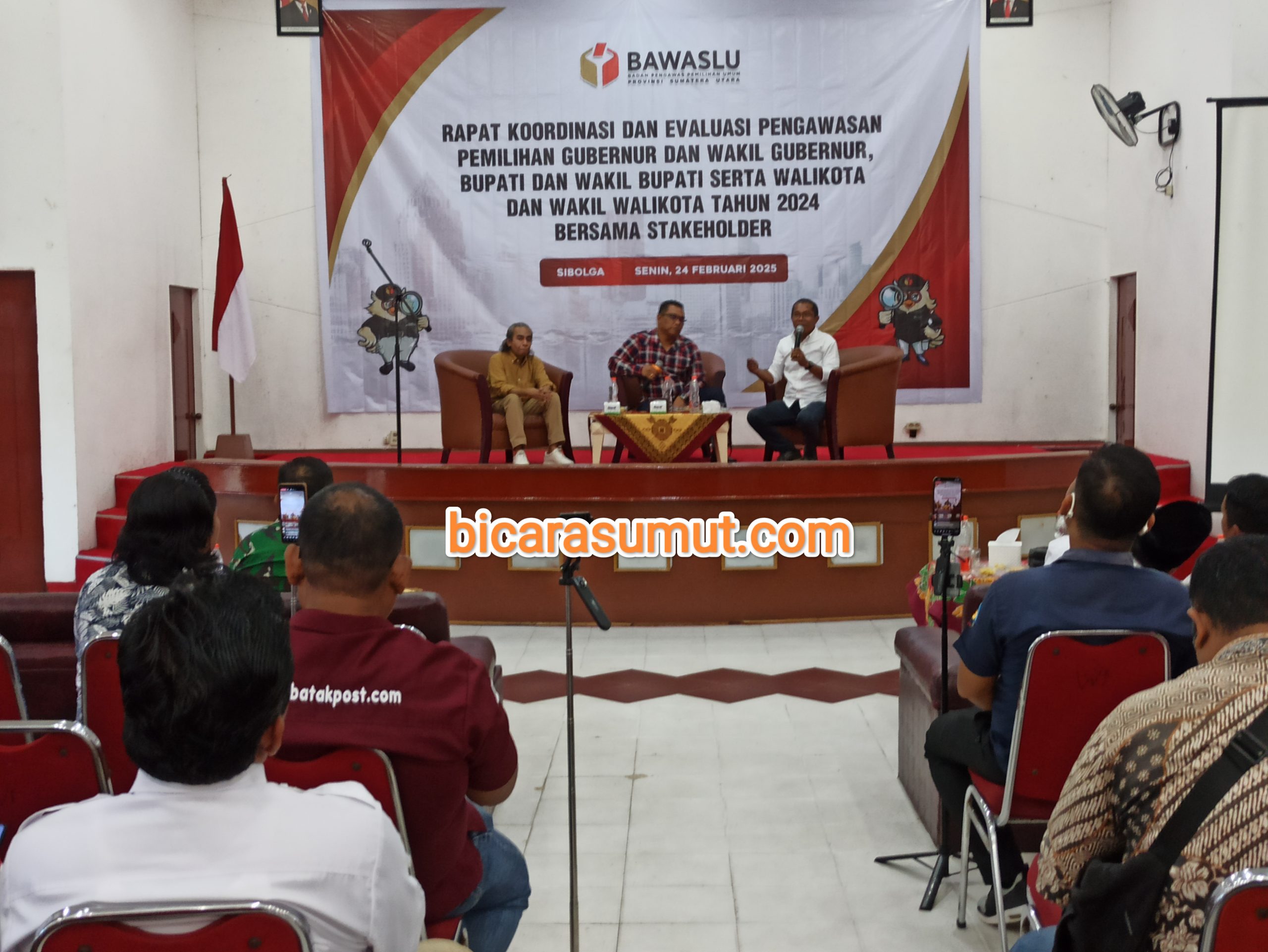 SIBOLGA, bicarasumut.com | Bawaslu Provinsi Sumatera Utara (Sumut) menggelar Rapat Koordinasi dan Evaluasi Pengawasan Gubernur dan Wakil Gubernur, Bupati dan Wakil Bupati serta Wali Kota dan Wakil Wali Kota Tahun 2024 bersama Stakeholder, Senin (24/02/25) di Aula Topaz Hotel WI, Kota Sibolga, Provinsi Sumut.