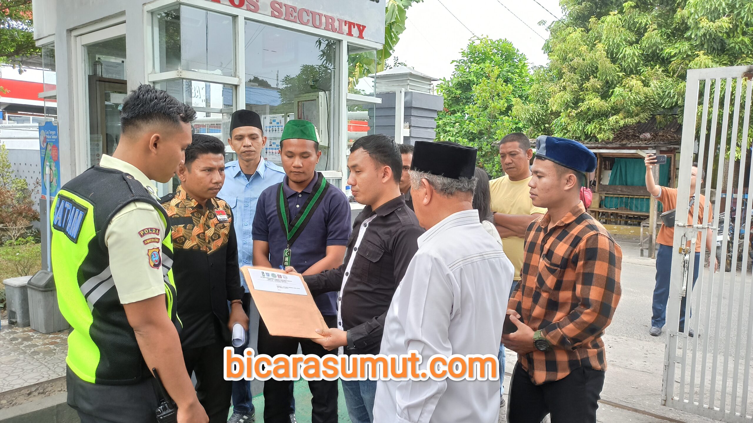 Gambar – Aliansi Mahasiswa Pemuda dan Masyarakat Sibolga-Tapanuli Tengah saat memberikan surat kepada Satpam Depot Pertamina Sibolga.