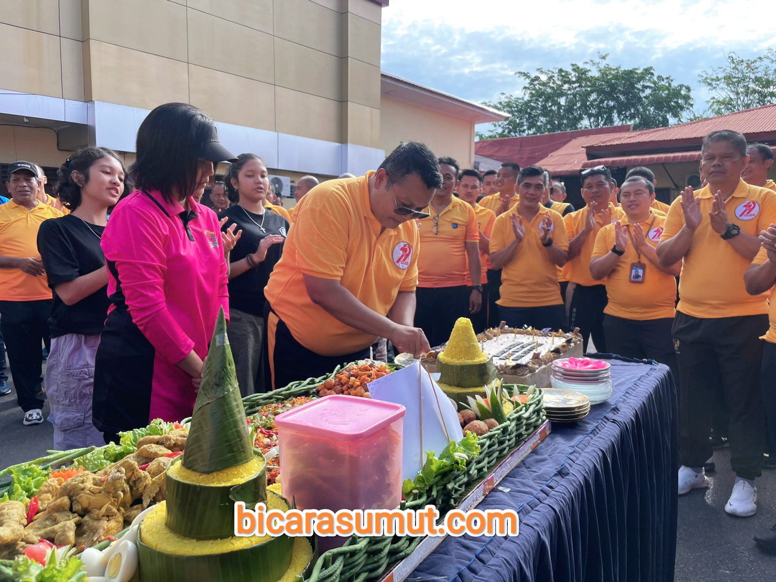 Gambar – Kapolres Sibolga saat melakukan potong tumpeng HUT Bhayangkara Ke-79 di Mapolres Sibolga.