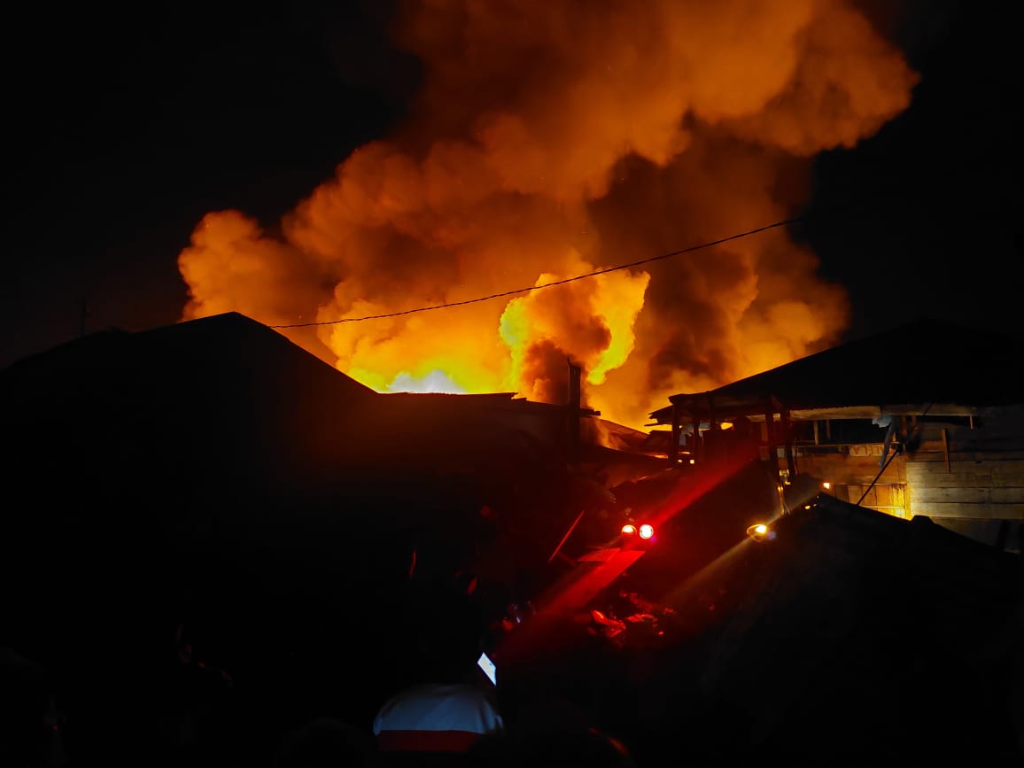 “Setengah jam kemudian pihak kepolisian dan mobil damkar pun tiba di lokasi. 2 unit mobil Damkar yang berusaha memadamkan api tidak berdaya, dimana api sudah menjalar, di karenakan kios di dalam pasar rapat dan terbuat dari kayu,” kata Midian dan Salomo.