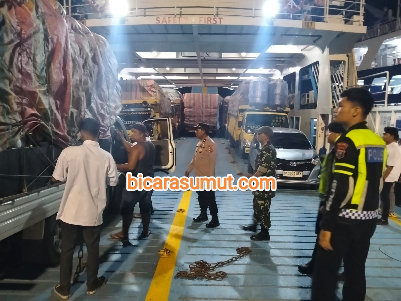 Gambar- Kepala Pos Pelayanan, IPDA HB. Siagian didampingi TNI dan Instansi terkait saat melakukan pengecekan keberangkatan kapal.
