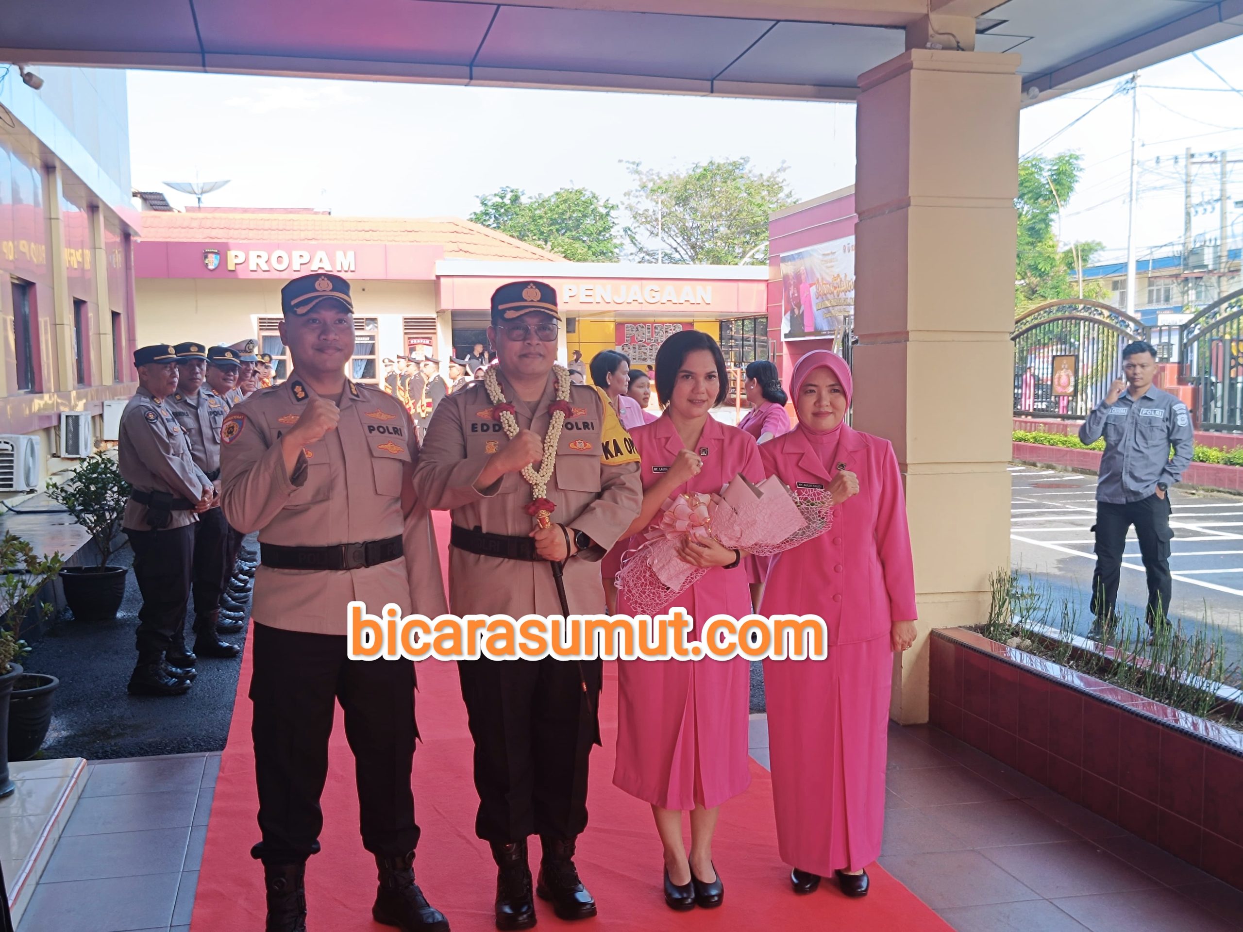 Gambar- AKBP Achmad Fauzy (sudut kiri), AKBP Eddy Inganta (kiri tengah) dan Istri Ny. Laura Eddy Inganta (tengah kanan) dan Ny. Aulia Fauzy (istri Kapolres Achma Fauzy (sudut kanan) di acara Sertijab....
