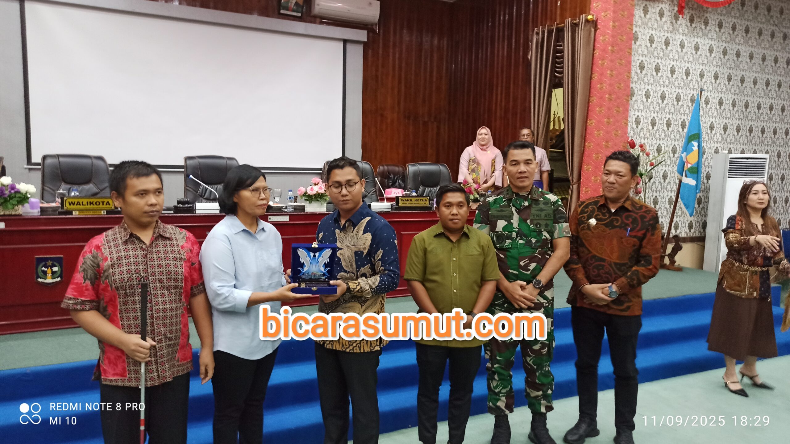 Gambar – Ketua DPRD Kota Sibolga didampingi Wali Kota dan Wakil Wali Kota Sibolga foto bersama memberikan Plakat kepada Ketua Koordinator Yayasan Rumah Kreatifitas RBM Biblevrow Rosdieri Sibaran...