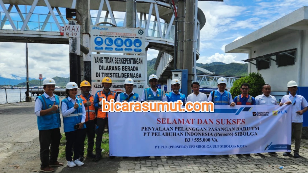 Gambar – Staff pegawai pelabuhan Pelindo foto bersama dengan pegawai PLN UP3 ULP Sibolga Kota usai pemasangan Baru pasokan listrik B3/555.000 VA. SIBOLGA, bicarasumut.com || PT Pelabuhan Indones...