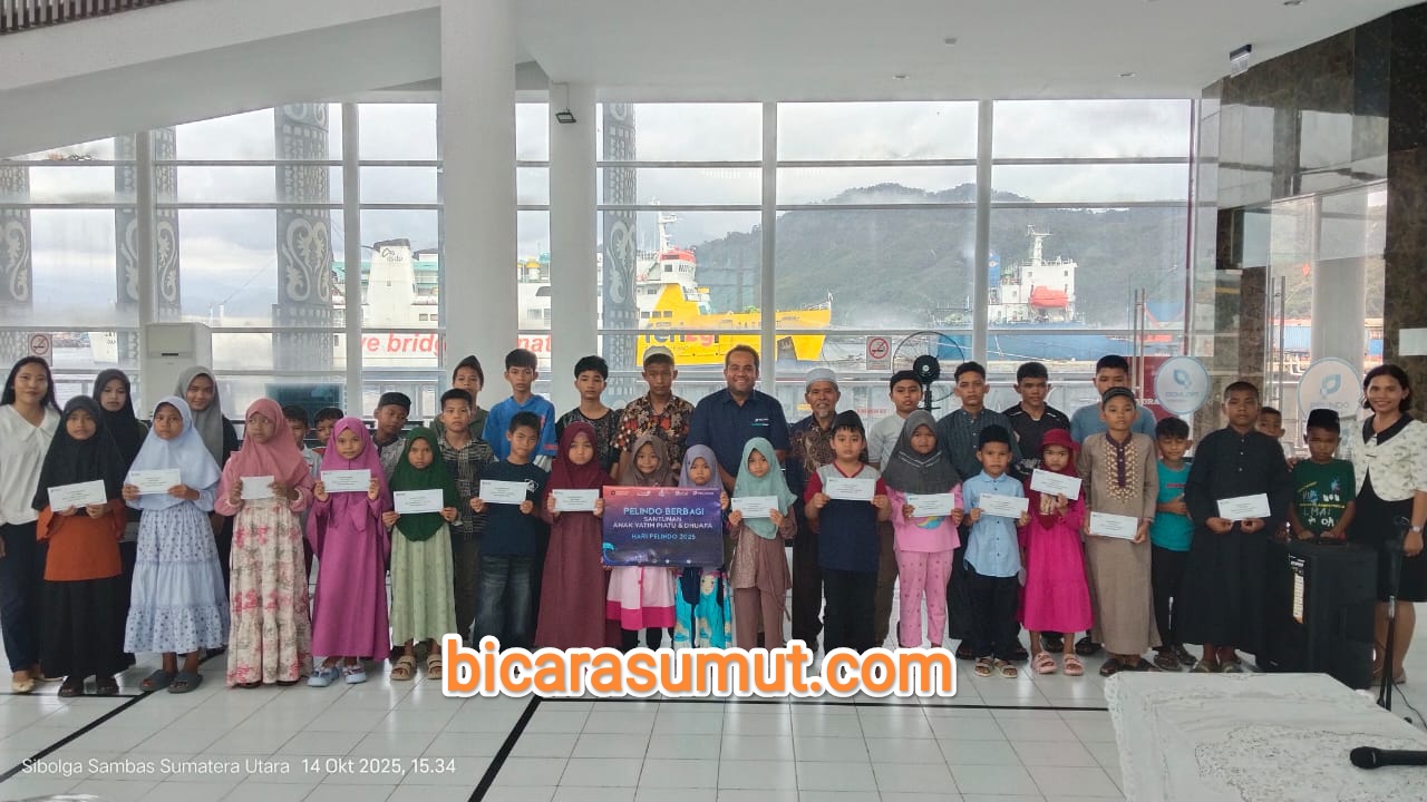Gambar – GM Pelindo Sibolga foto bersama dengan anak yatim usai membagikan santunan. SIBOLGA, bicarasumut.com || Dalam rangka memperingati Hari Pelindo ke-4, PT Pelindo Regional 1 Sibolga kembal...