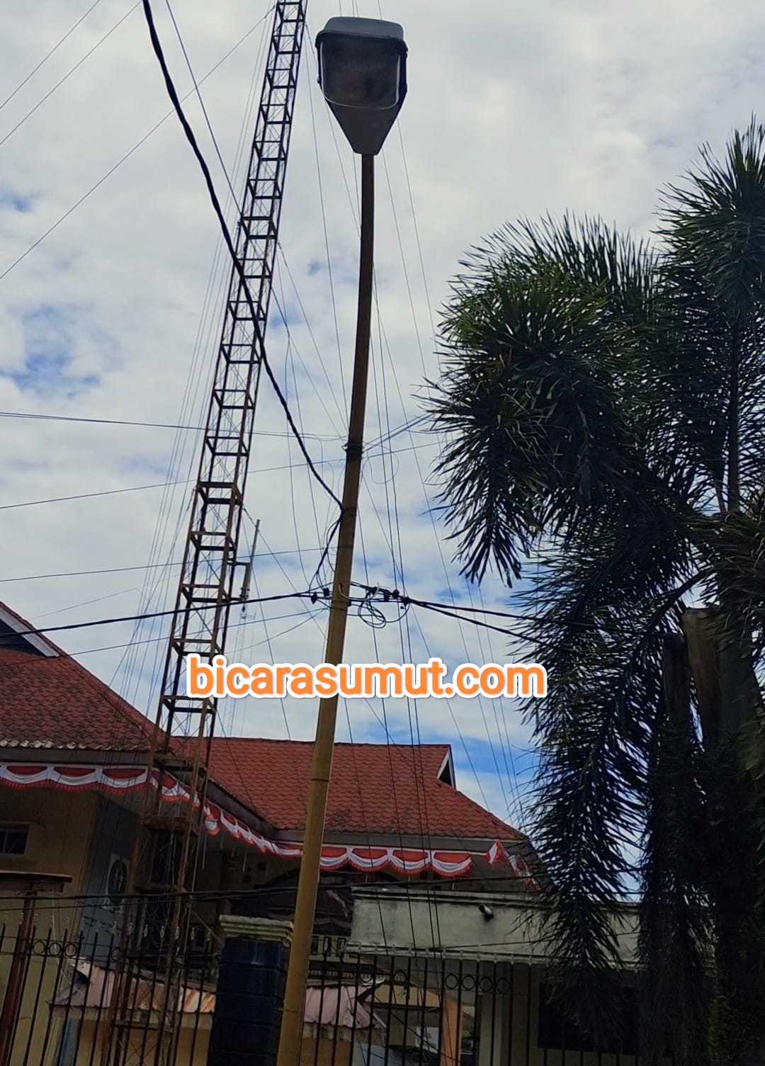 Gambar – Salah satu Tiang LPJU di Kota Sibolga yang dipakai Vendor Internet mencantolkan kabel internetnya.
